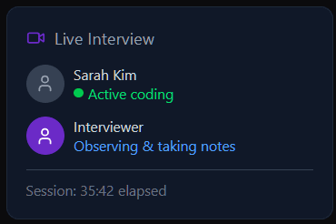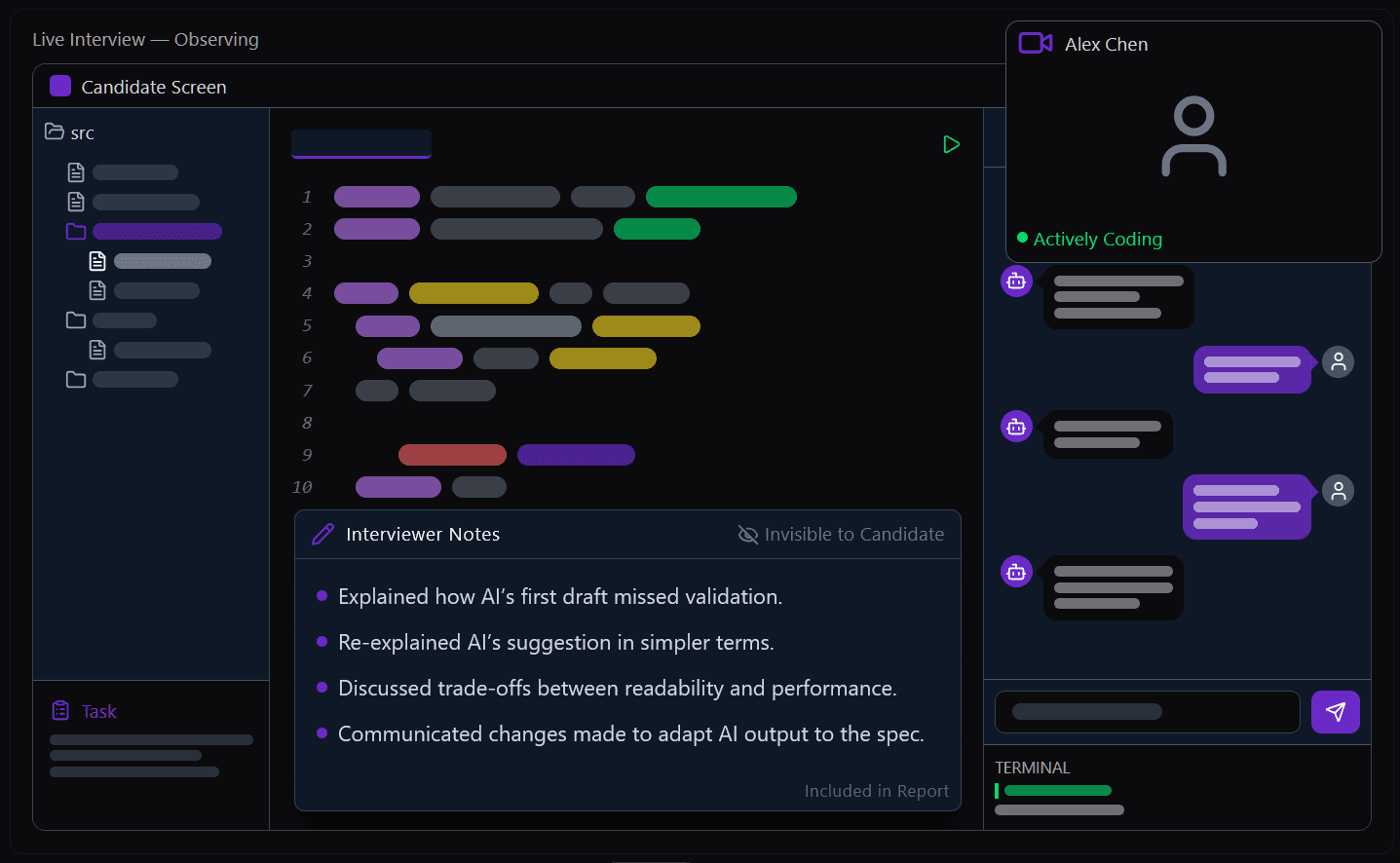 Track both code quality and communication skills — from first prompt to final refactor. Built-in notes let you capture how clearly candidates explain decisions while you follow their live workflow.
