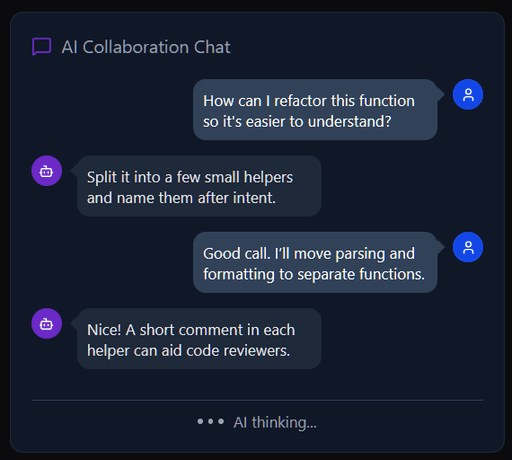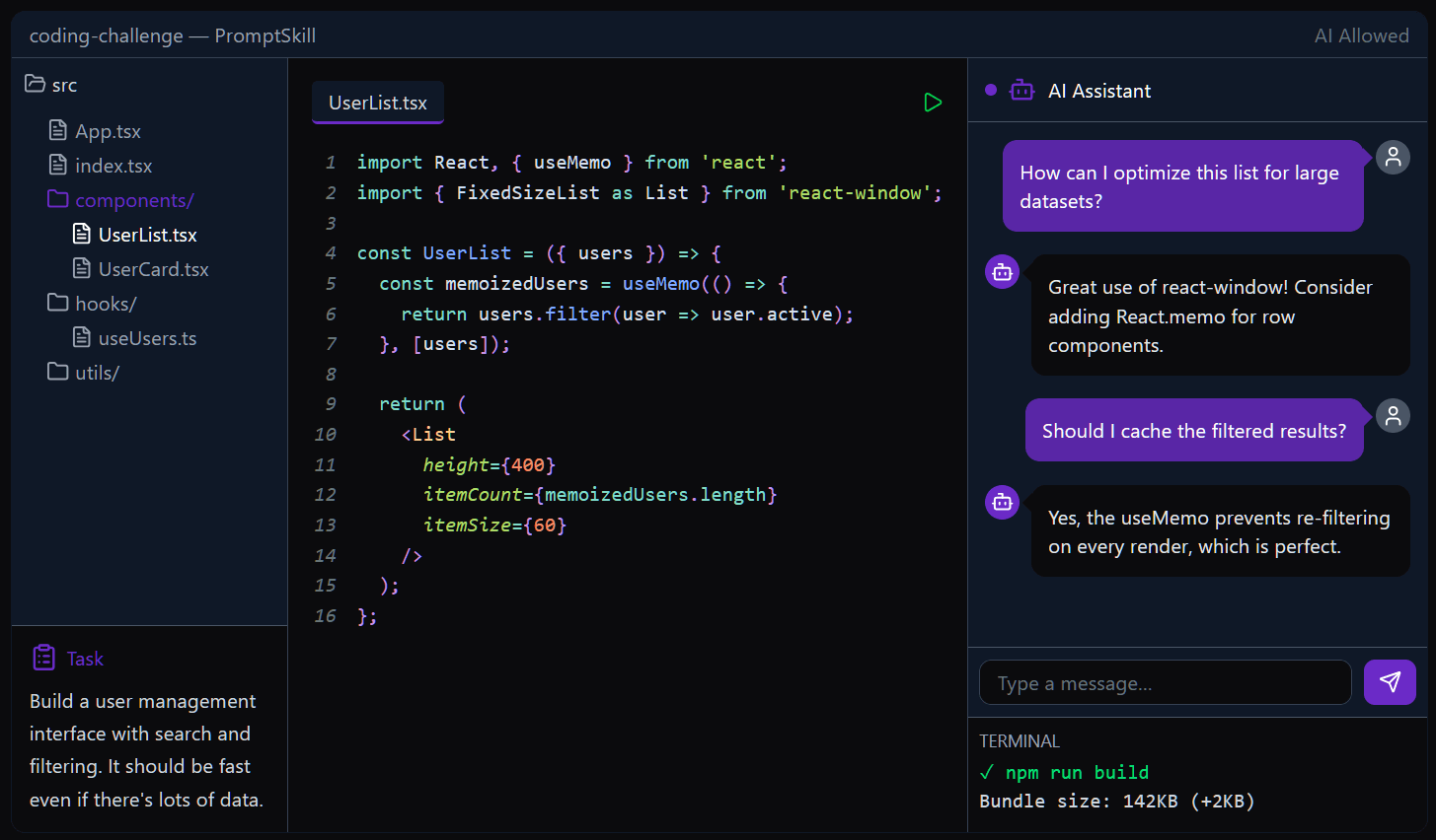 Real devs don’t work in a vacuum — they build production-grade systems. With AI chat and authentic editor tools, every choice, explanation, and refactor mirrors how candidates truly work on the job.