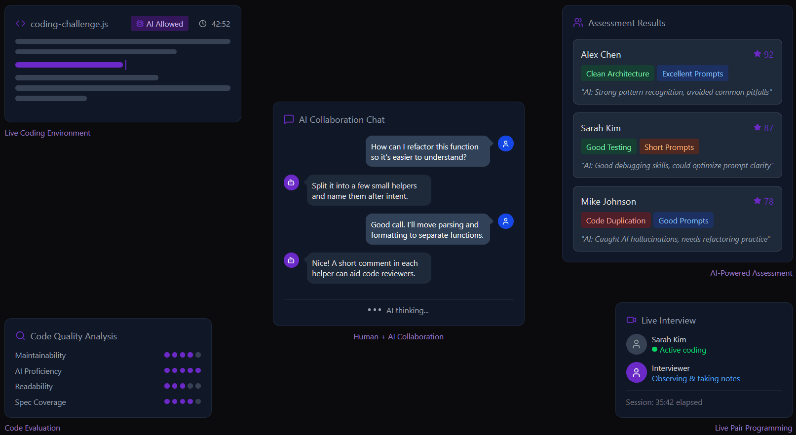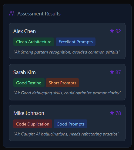 Every prompt, response, and line of code is tracked and scored, giving you a fair picture of skills and AI use.