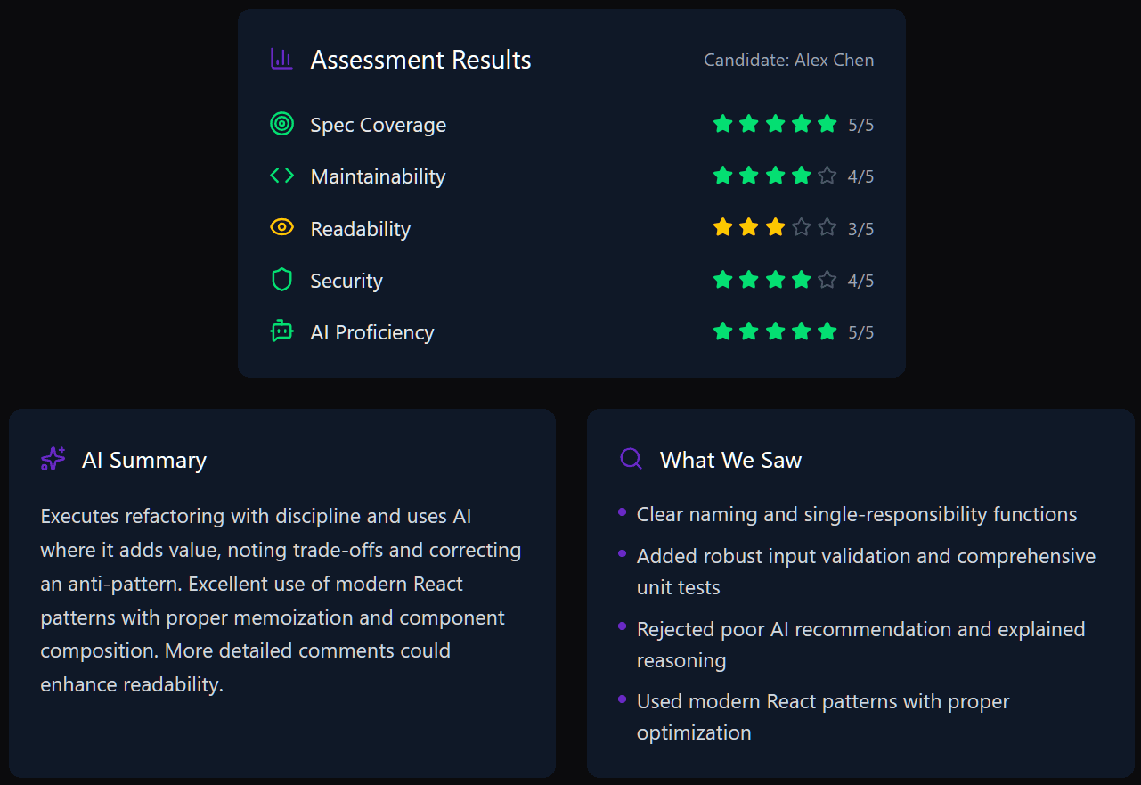 Go beyond output. We evaluate code quality, reasoning, and AI use to reveal real strengths and weaknesses. Consistent scoring and transparent rubrics mean assessments you can rely on.