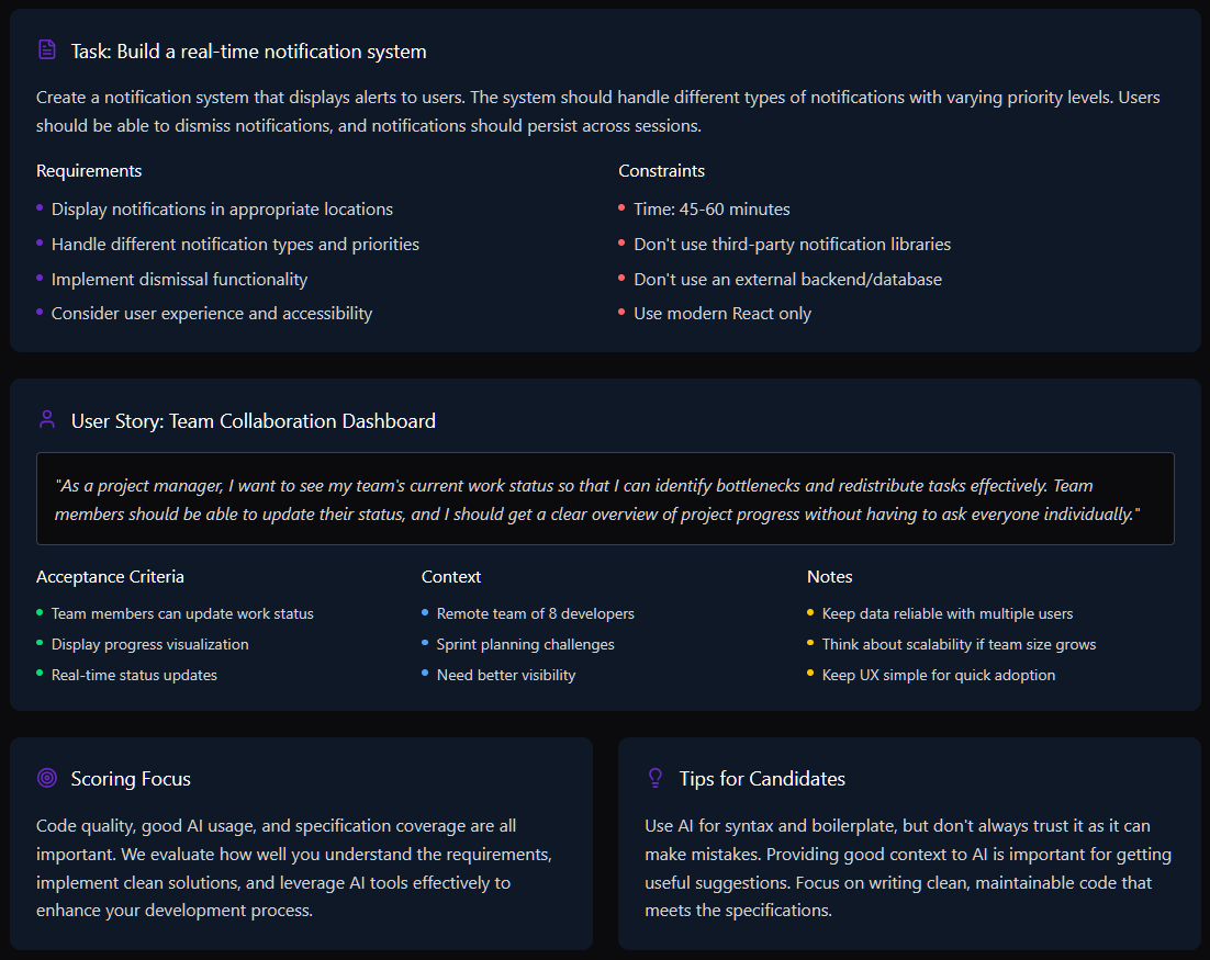 Candidates work through practical, production-like challenges that show how they really solve problems — with AI included.